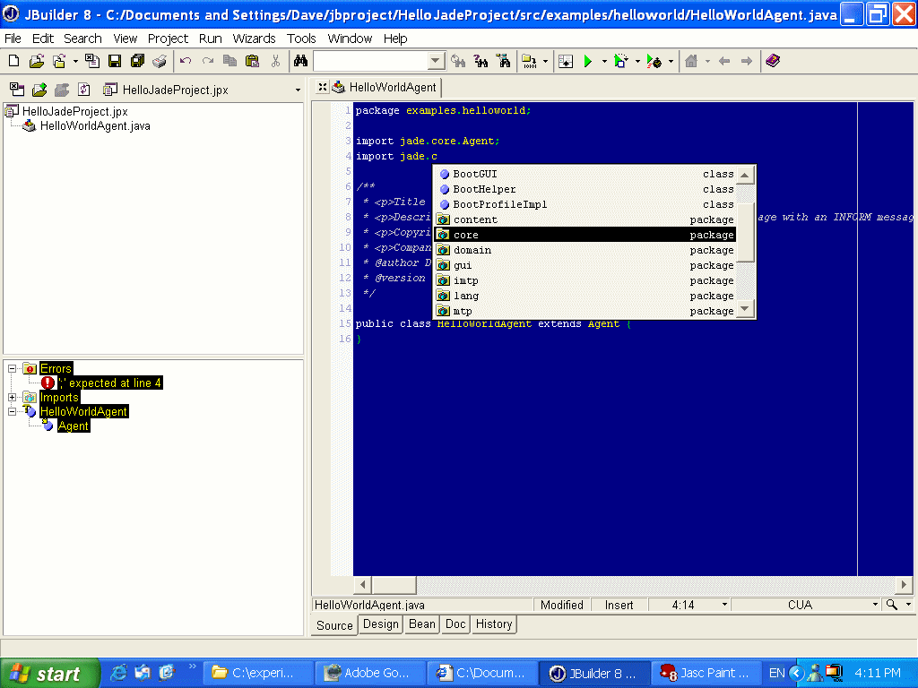 The JBuilder editor has many nice features. You can colour code various things. It also checks for lexical errors before compilation. Another neat feature are the windows that pop up allowing you to reduce typing or review the number and types of arguments to a method. For example, we want to add a CyclicBehaviour to the HelloWorldAgent. As you type impor ... Various completion windows pop up: