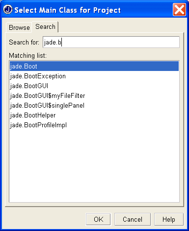 (Various classes appear as you type jade. .. into the Search window. We want jad.Boot.) Select jade.Boot and click OK. You are returned to the Runtime Configuration window. Now fill in your Application parameters.